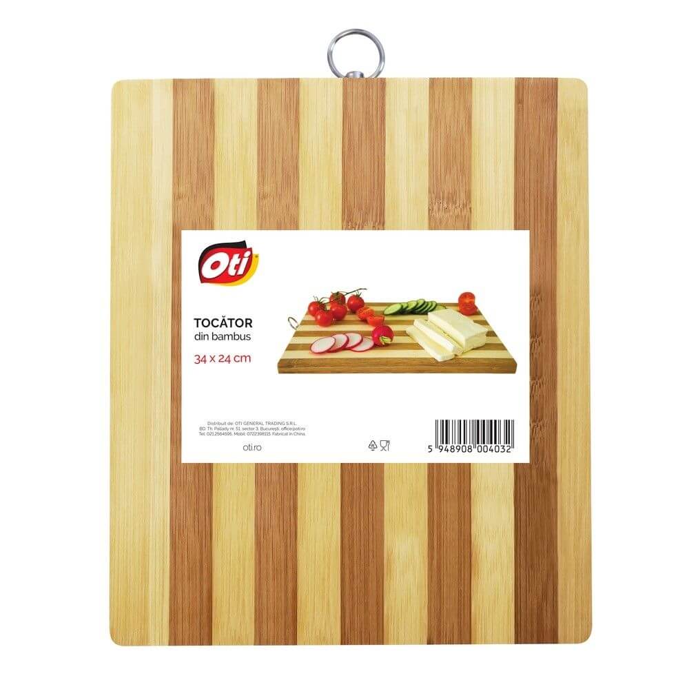 Comercializam tocator din lemn de bambus OTI, dimensiuni 34x24 cm, marimea M, forma dreptunghiulara, culoare natur. Materialul permite maruntirea alimentelor pentru procesul de gatit indiferent de duritatea cutitului, fara a-si schimba forma. Recomandat pentru tocat, maruntit, curatat alimente.